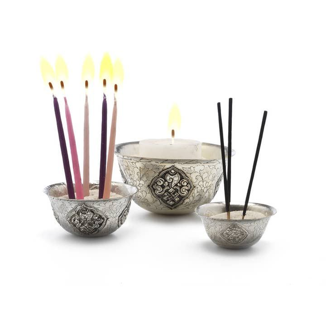 Tibetische buddhistische Opfergaben-Schalen, versilbert, handgefertigt in Patan (Nepal) von Newari-Handwerkern. Verziert mit den Astamangala; 8 buddhistische Zeichen des Wohlstands. Klein: 6 cm Durchmesser. Mittel: 8 cm Durchmesser. Groß: 12 cm Durchmesser.