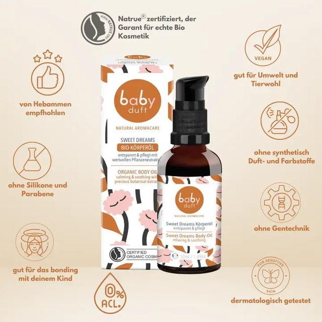 Dieses aussergewöhnlich entspannende Bio Körperöl, wurde von Schweizer Experten für Phytotherapie und Aromatherapie entwickelt. Es schenkt dank wertvoller Inhaltsstoffe und einzigartiger Rezeptur tiefe Entspannung und hilft das Erlebte vom Tag besser zu verarbeiten. -mit Bio Mandel- und Calendulaöl, Mimose, Rose, Kamille und Lavendel -neuartige Formulierung wirkt entspannend und hilft einzuschlafen -regeneriert und pflegt zarte Baby- und Kinderhaut dank wertvollem Rosenöl -wirkt beruhigend bei Irritationen wie Hautausschlägen und Rötungen -hilft bei Bauchweh und Koliken dank wertvoller römischer Kamille